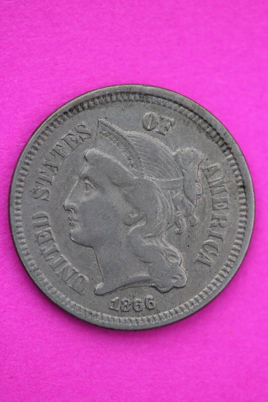 1866 Hi Grade Three 3 Cent Nickel Scarce Semi Key Date Coin Philadelphia Mint 51