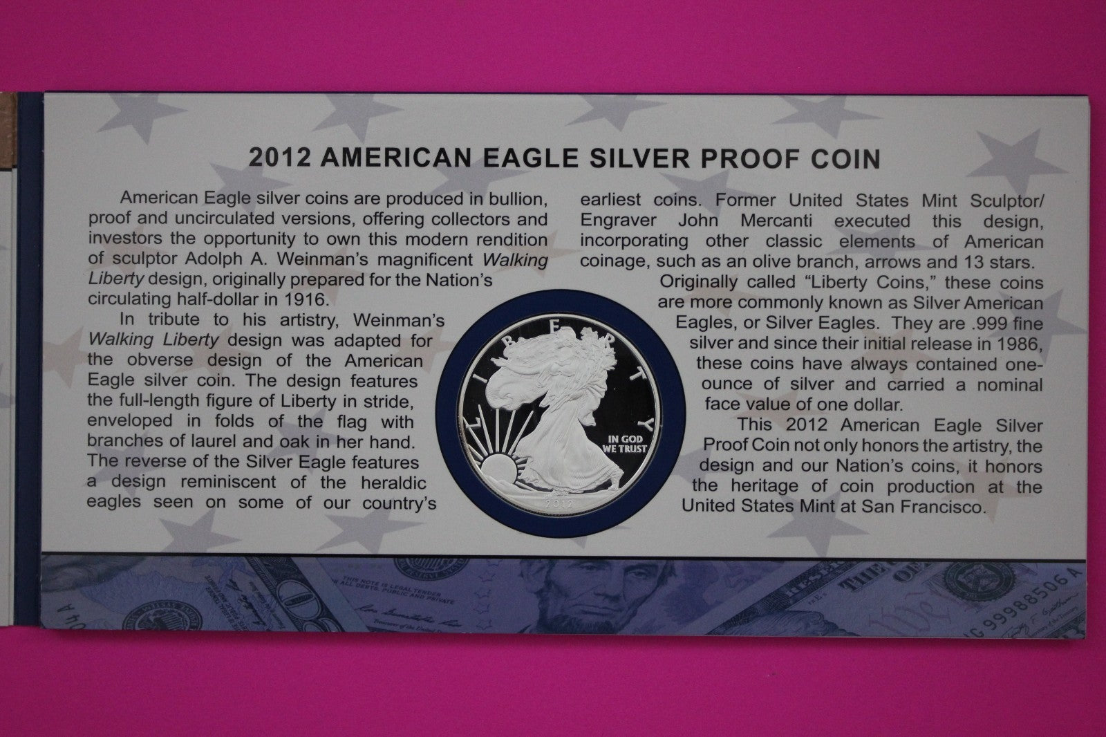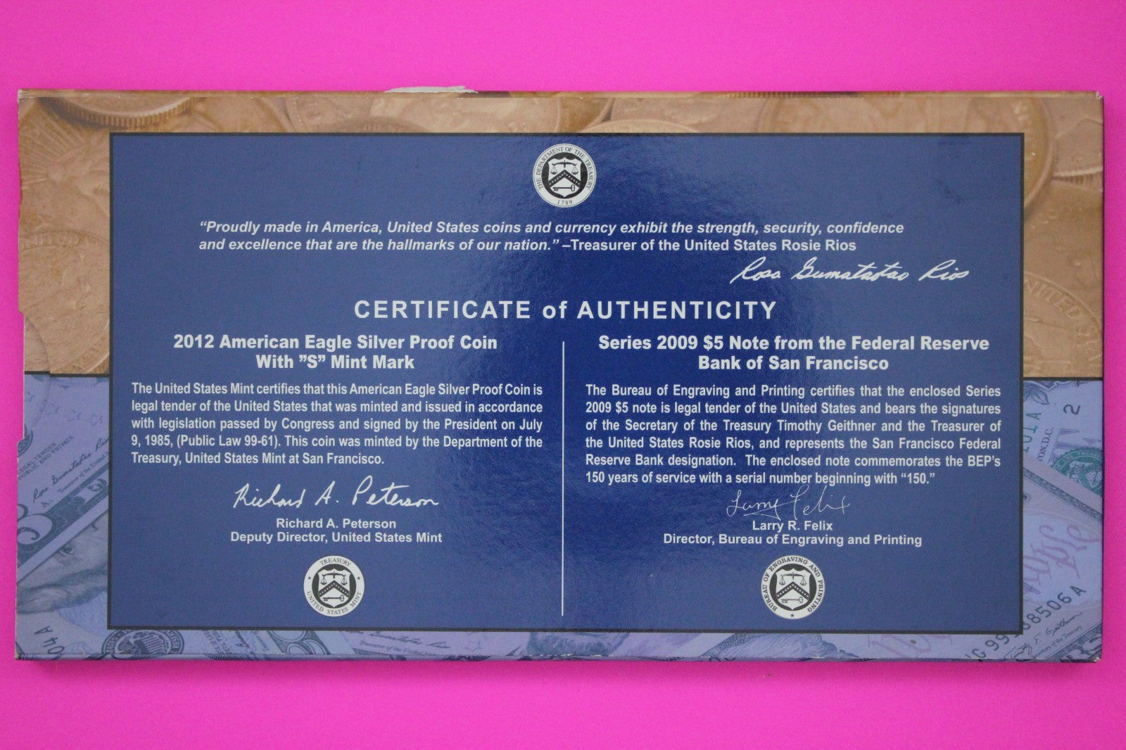 2012 Coin & Currency Set Proof 1 OZ .999 Fine Silver Eagle & $5 Note COA 9024