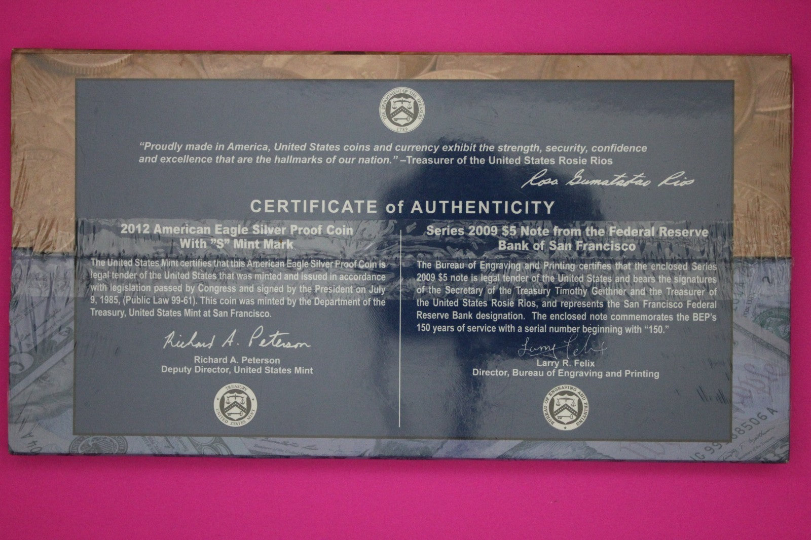 Mint Sealed 2012 Coin & Currency Set Proof 1 OZ Silver Eagle & $5 Note COA 9009