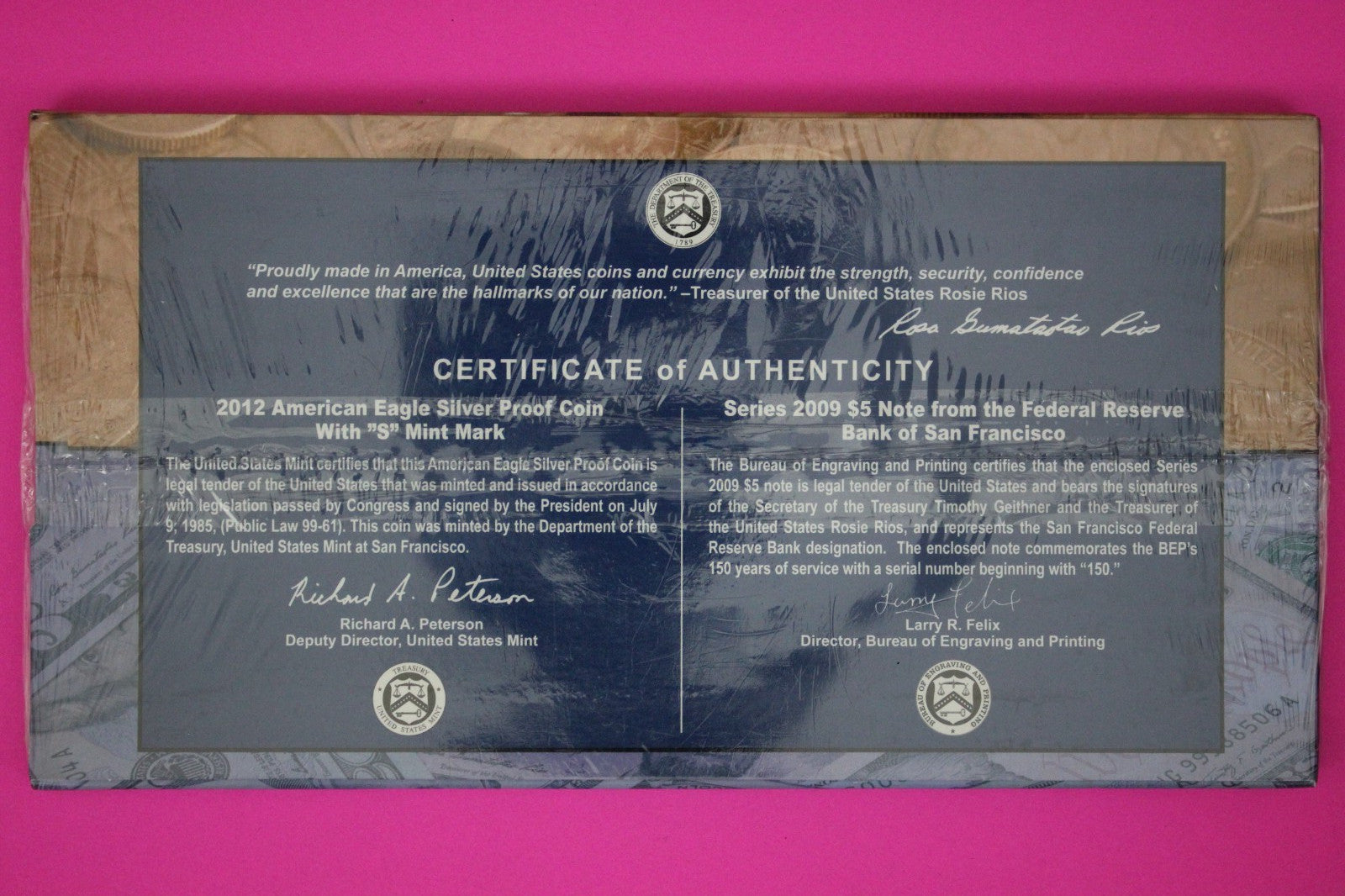Mint Sealed 2012 Coin & Currency Set Proof 1 OZ Silver Eagle & $5 Note COA 9013