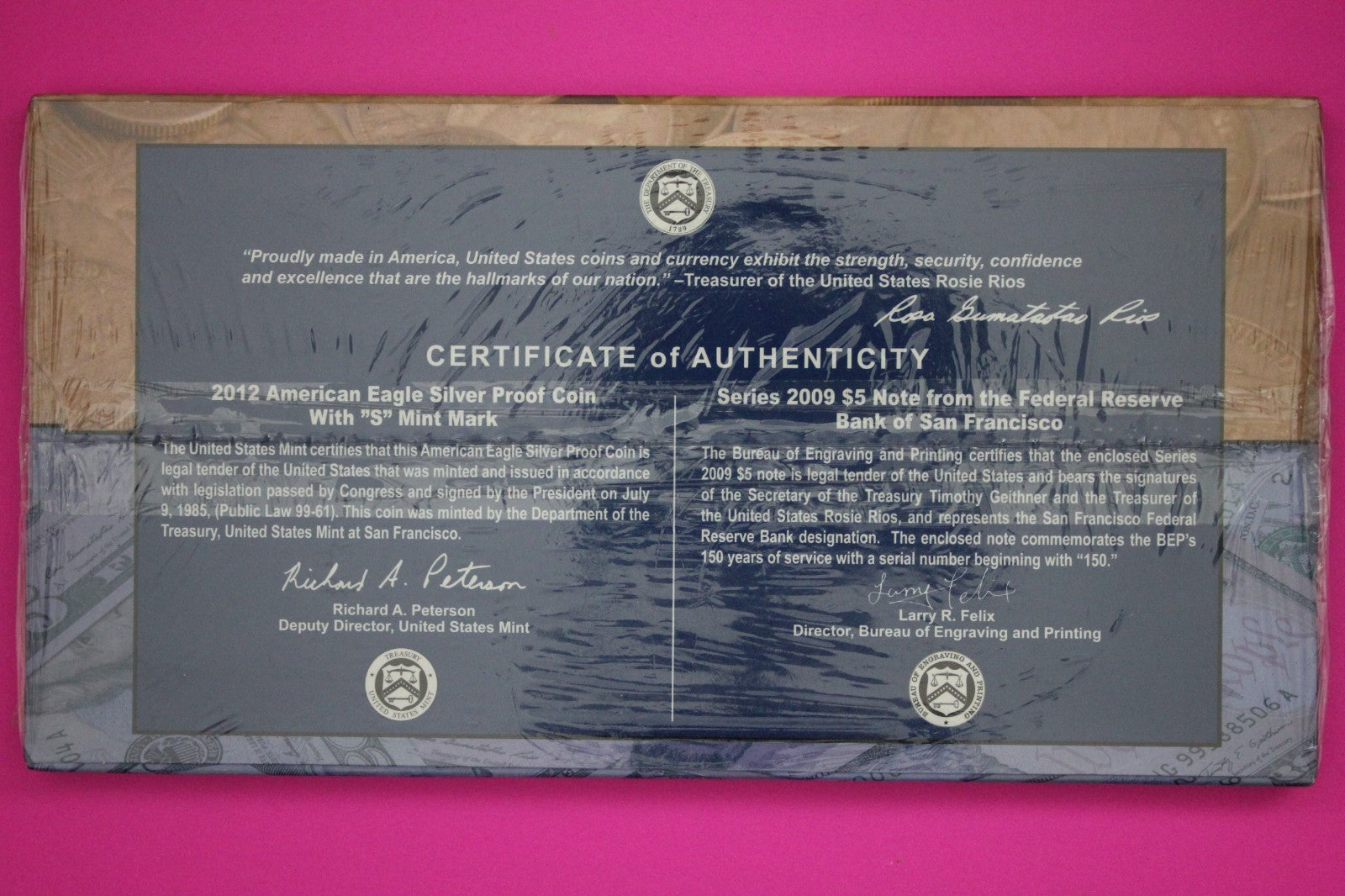 Mint Sealed 2012 Coin & Currency Set Proof 1 OZ Silver Eagle & $5 Note COA 9015