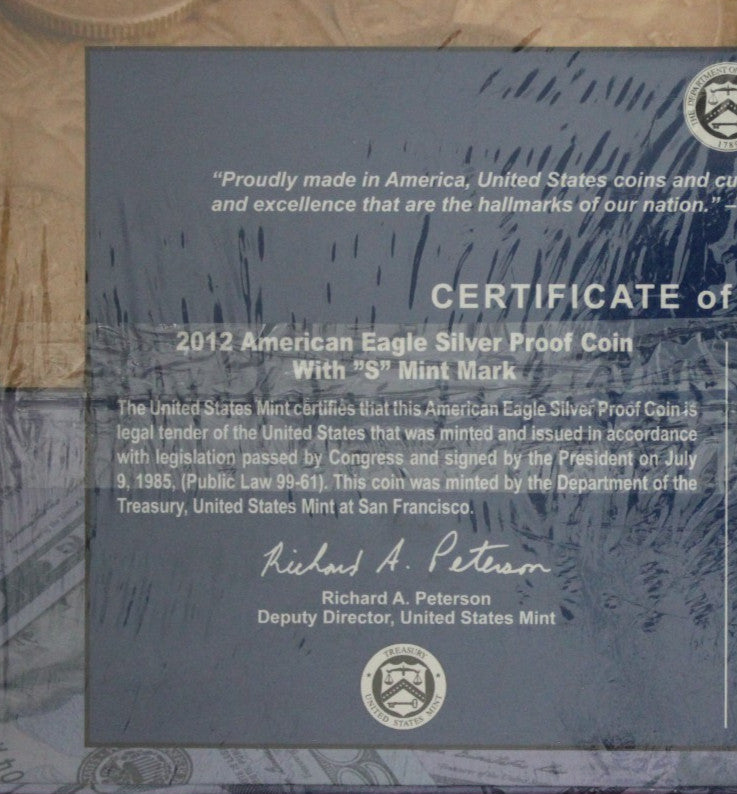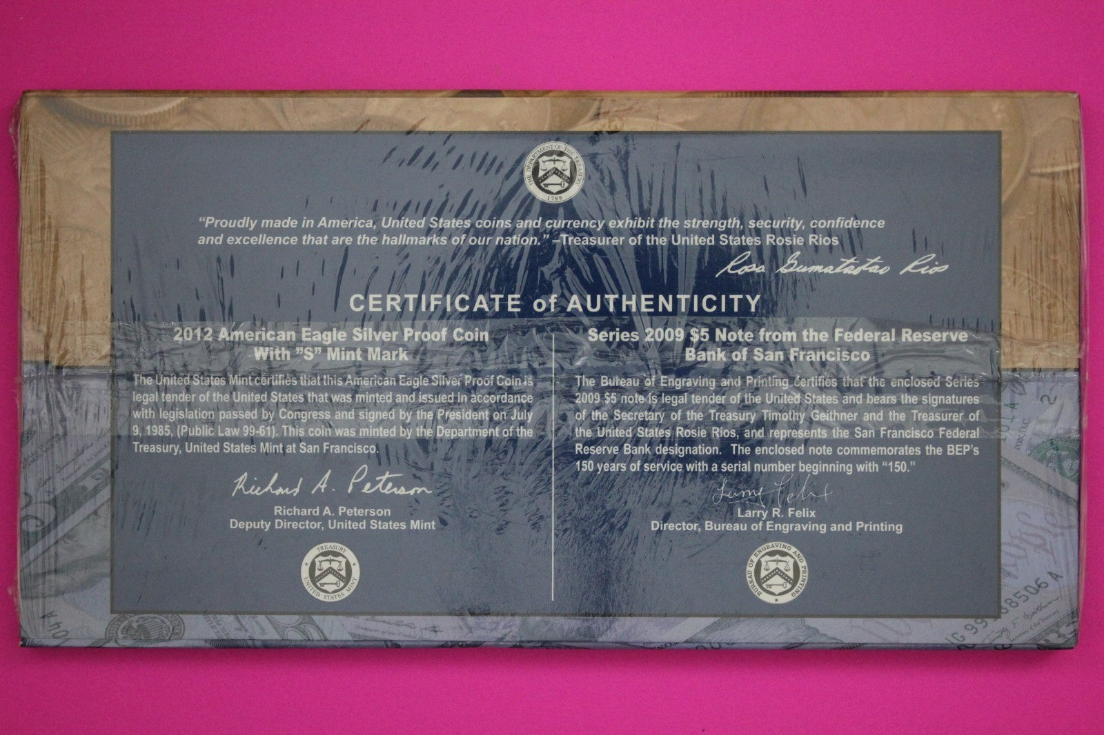 Mint Sealed 2012 Coin & Currency Set Proof 1 OZ Silver Eagle & $5 Note COA 9016