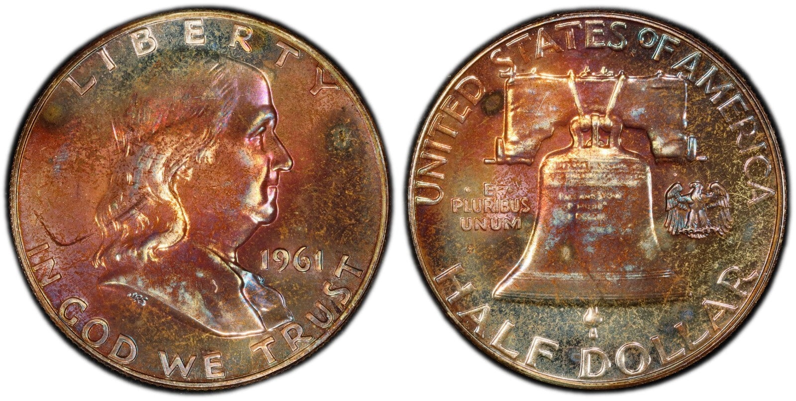 Rainbow Toned 1961 Silver PR 65 Ben Franklin Half PCGS Graded Authentic Slab 170