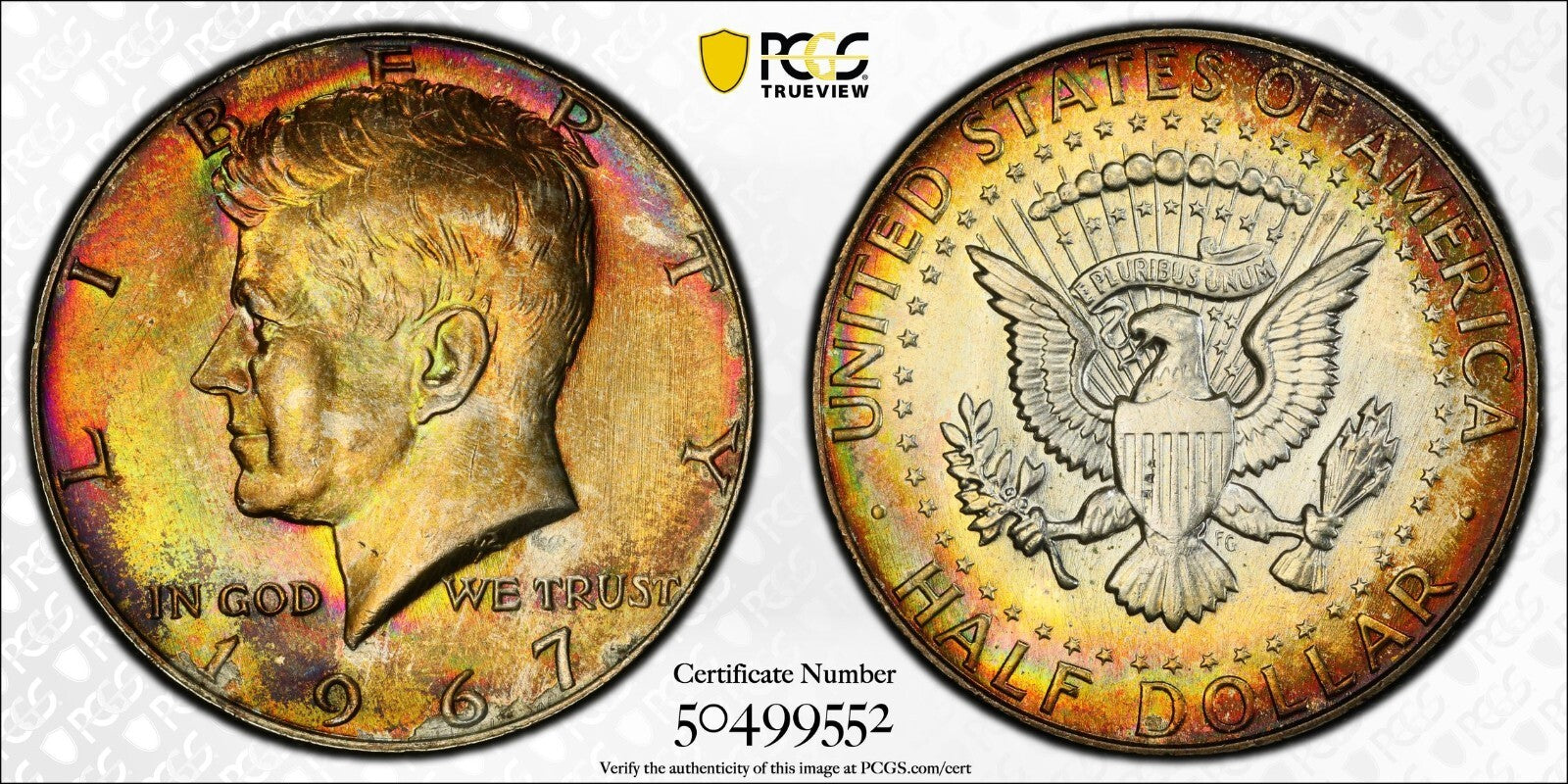 Rainbow Toned 1967 Silver MS 65 John F Kennedy Silver Half Dollar PCGS Slab 146
