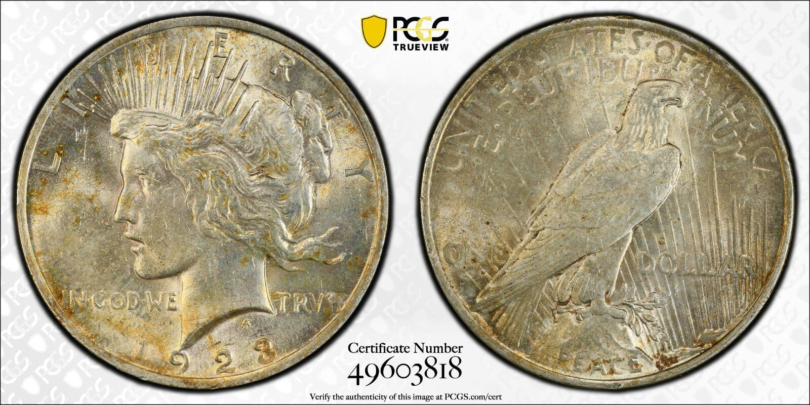 Toned 1923 P MS 62 Peace Silver Dollar PCGS Graded Certified Authentic Slab 78